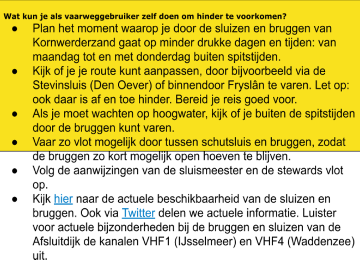 Rijkwaterstaat verwacht dit vaarseizoen tot en met september meer hinder en vertragingen bij Kornwerderzand. Hoewel Rijkswaterstaat haar best doet de hinder zoveel mogelijk te beperken, worden vaarweggebruikers geadviseerd hun reis goed voor te bereiden, de drukste momenten te vermijden en rekening te houden met langere wachttijden bij het passeren van de bruggen en sluizen bij Kornwerderzand.